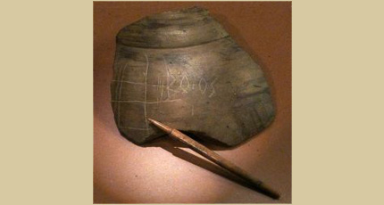 Deutsch: Inschrift "BOIOS" oder "BAIOS" auf einer keltischen Tonscherbe aus Manching im kelten römer museum Manching.
